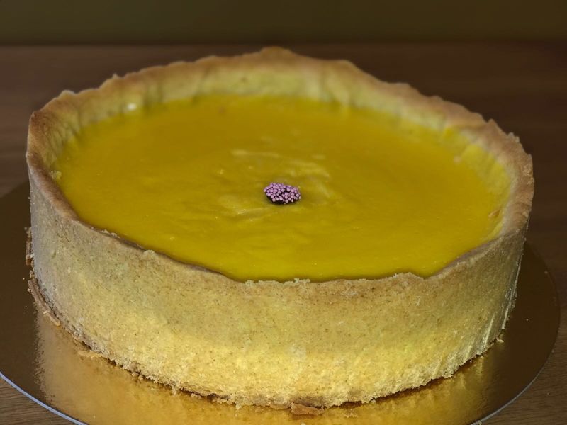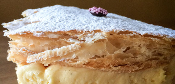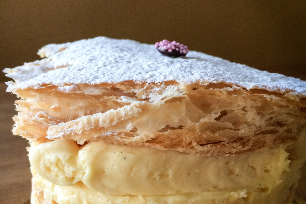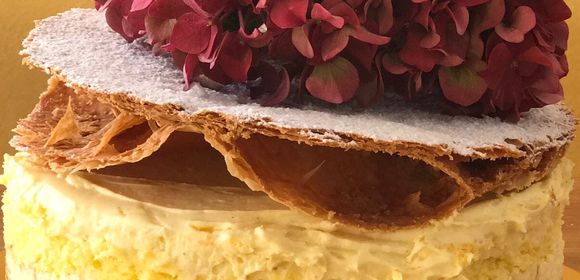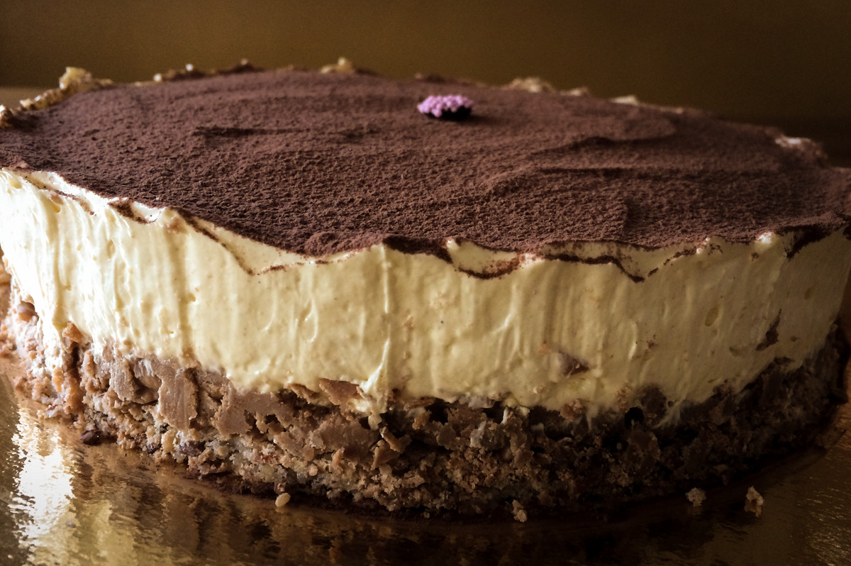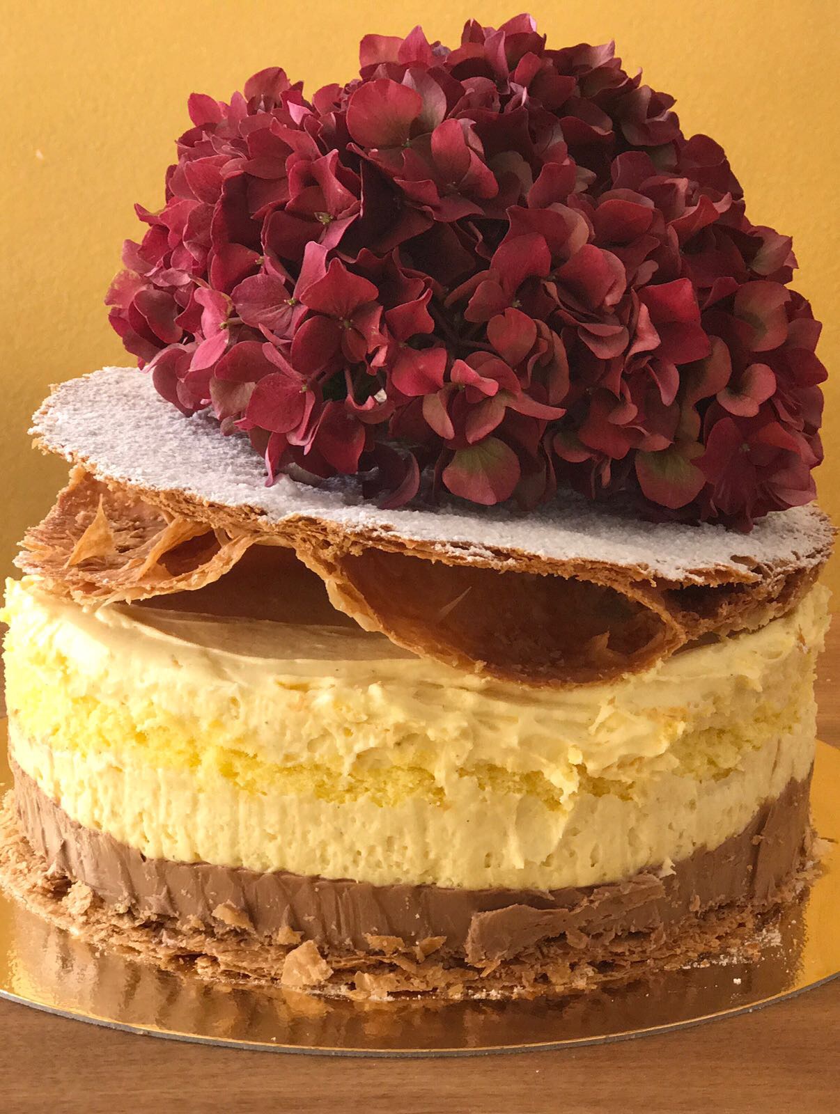 Karamellisiert Pasta a Confetti (Kalabresische Teigbällchen, im Olivenöl ausgebacken) als Torten-Fundament, kombiniert mit diversen Crèmes.
